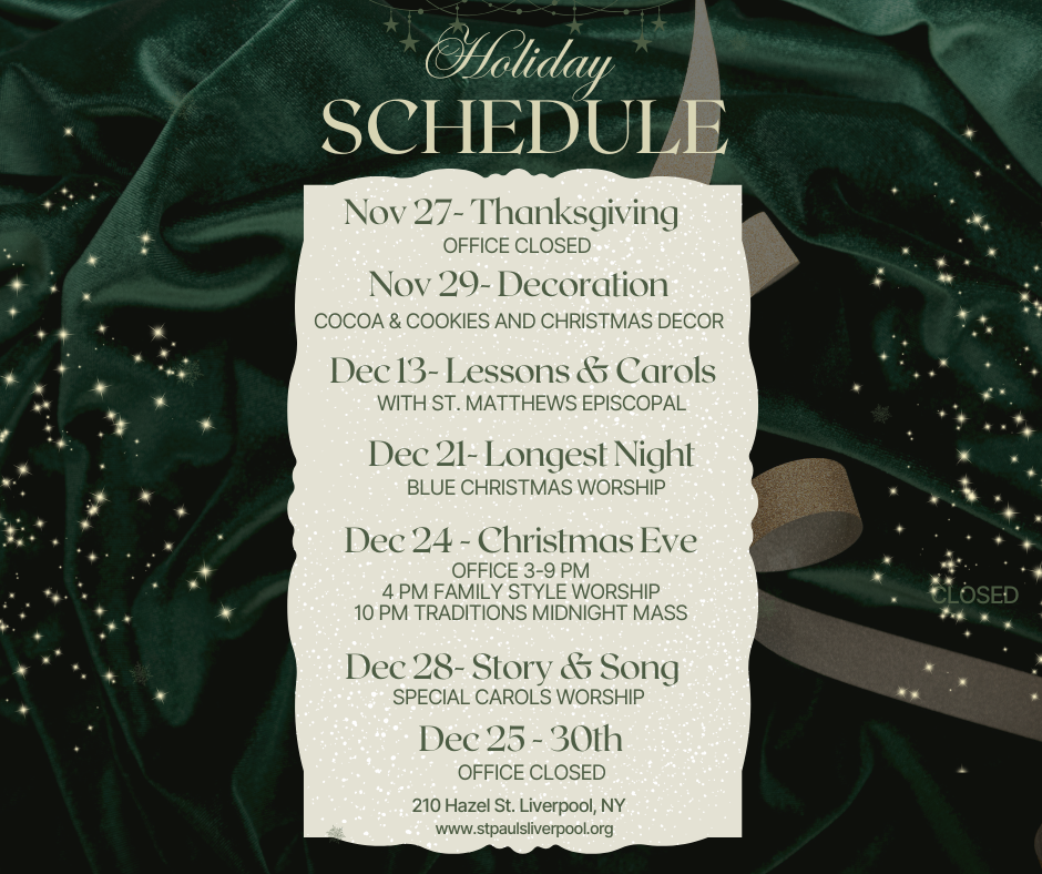 Image: Holiday Schedule: November 27 - Thanksgiving (office closed). November 29 - Decoration (cocoa and cookies and Christmas decor). December 13 - Lessons & Carols (with St. Matthew’s Episcopal). December 21 - Longest Night (Blue Christmas worship). December 24 - Christmas Ever (office 3-9 p.m., 4 p.m. family-style worship, 10 p.m. traditional midnight mass, December 28 - Story & Song (special carols worship), December 25-30 (office closed).