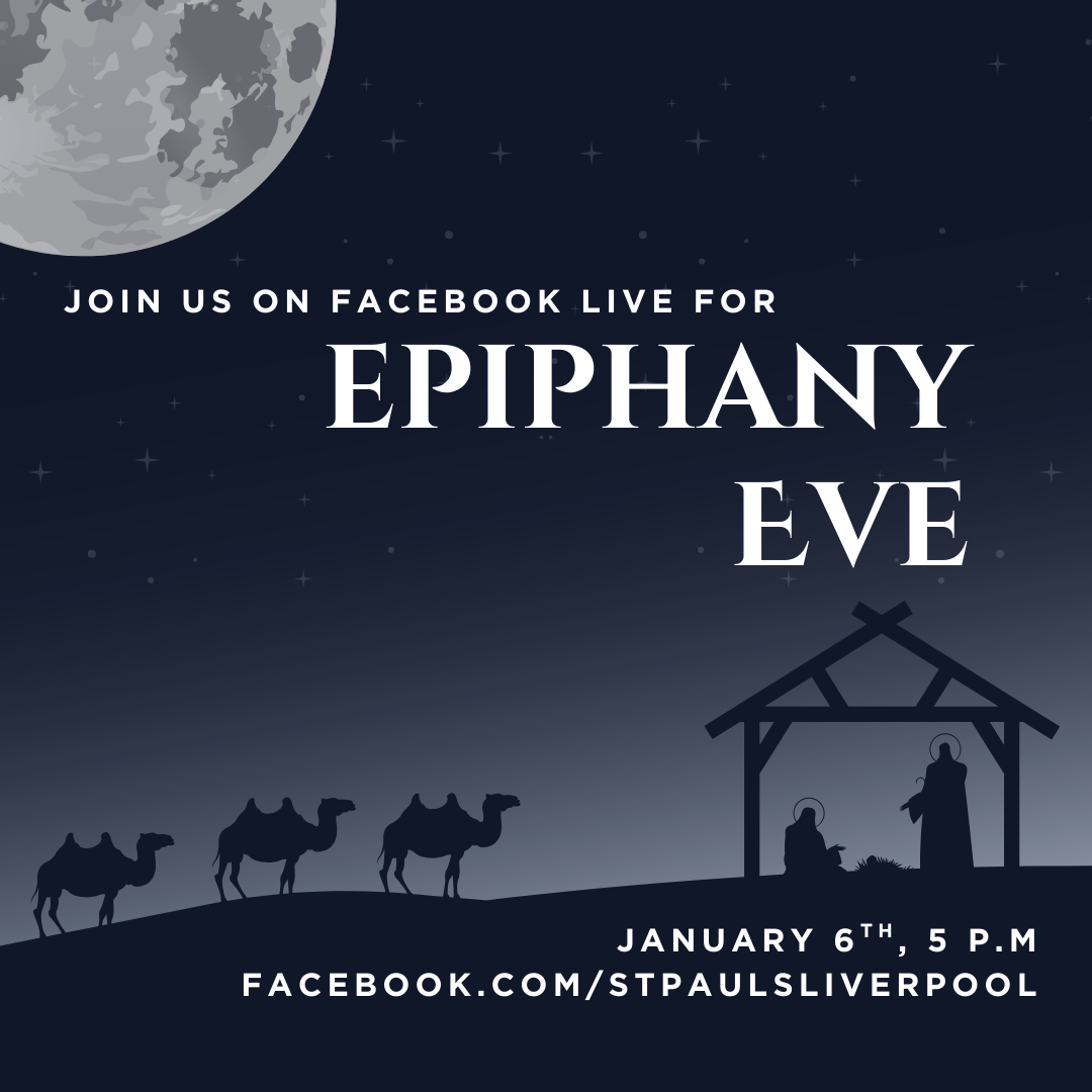Image: A midnight-blue graphic that shows the three wise men in silhouette approaching the manger scene, with a full moon above. Text reads: “Join us on Facebook Live for Epiphany eve. January 6th, 5 p.m., facebook.com/stpaulsliverpool.”